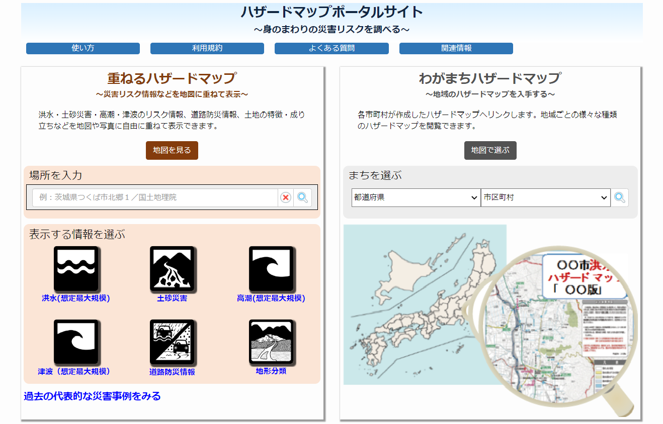 国土交通省が運営する、「ハザードマップポータルサイト」は、市町村が作成している各種のハザードマップを集約し、インターネット上で一元的に検索・閲覧できるようにしたポータルサイトです。