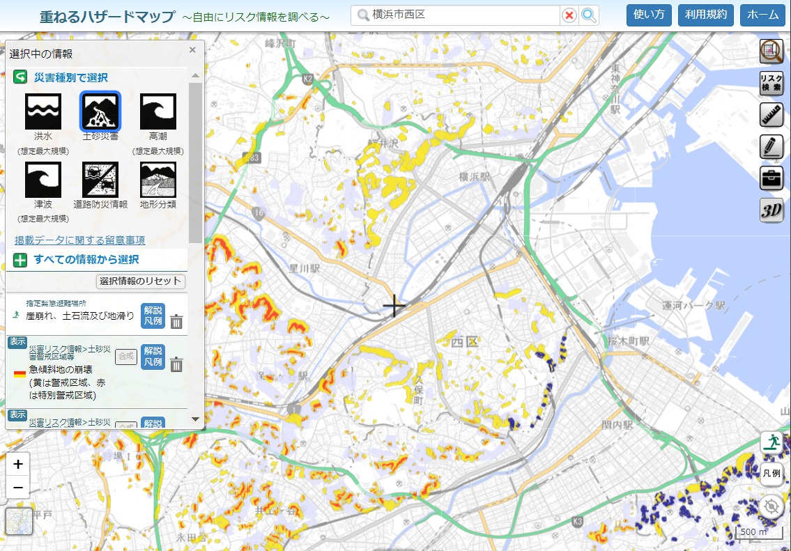 実際にハザードマップポータルサイトを使って災害情報を見てみました。 ハザードマップポータルサイトトップページの「場所を入力」の検索窓に自分が調べたい地域を入れて検索すると、図1の地図が出てきます。(今回は横浜市西区で調べてみました。) 次に左側にあるアイコンで、知りたい災害をクリックすると図2のとおり結果が出てきます。(今回は、土砂災害で調べてみます。)
