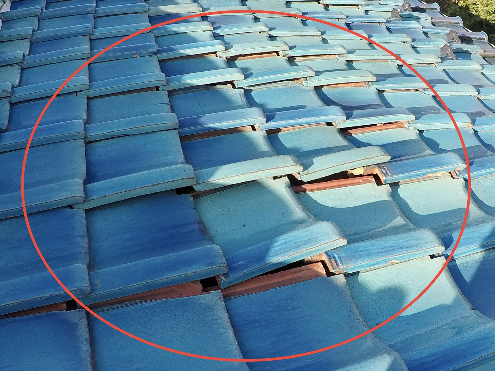 台風による強風の影響を受け、屋根瓦が全体的にずれてしまっている写真です。